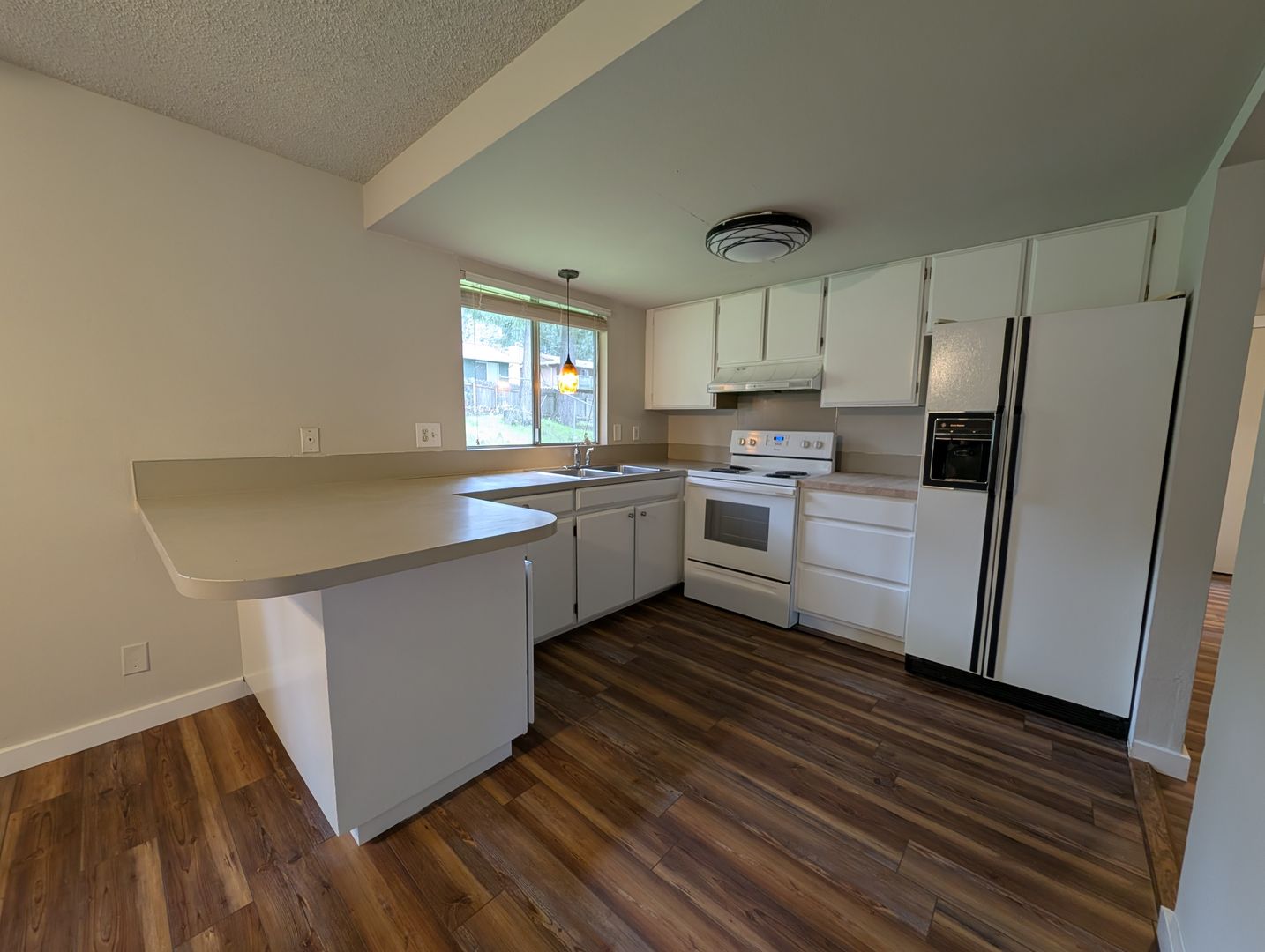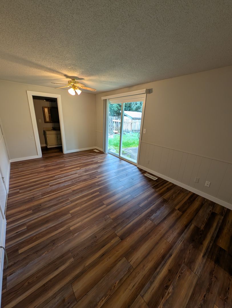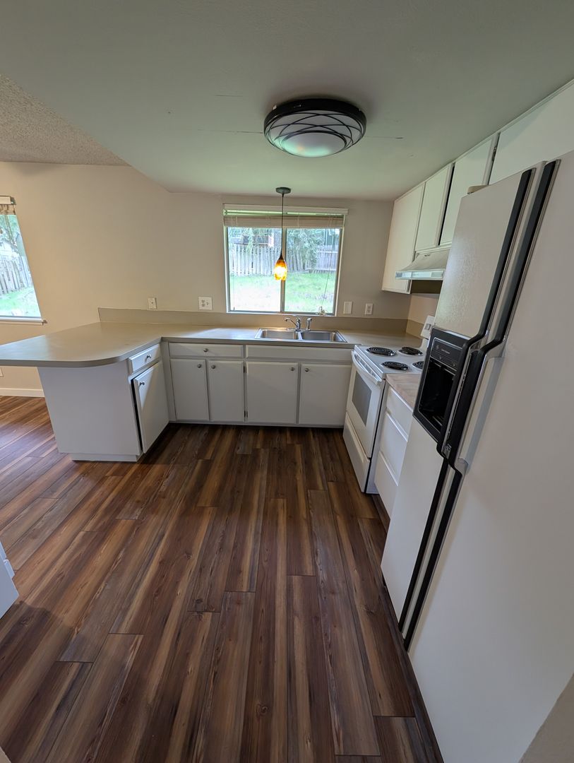The kitchen includes small breakfast bar and portable dishwasher as well as an attached dining room and open layout. Larger living area includes functional wood burning fireplace! Large two car garage includes secondary freezer and washer / dryer hookups. Step outside and you’ll find one of the home’s standout features: a huge, fully fenced yard with plenty of space to unwind, garden, play, or give pets room to roam. It’s a true Northwest backyard—private, usable, and ready for whatever you imagine. Pets allowed with references and applicable fees.